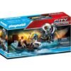 Para las operaciones complicadas se llama a la unidad especial PLAYMOBIL. Para estar bien preparados para una emergencia, los policías practican la desactivación y la retirada de materiales peligrosos. Primero se acordona la zona de peligro y luego llega el especialista con su quad. Apaga el fuego con un disparo de la pistola de espuma y luego recoge cuidadosamente el material explosivo con el brazo de agarre. Su compañero le apoya con instrucciones a través del megáfono. Gracias a su excelente trabajo en equipo, la tarea se completa rápidamente.