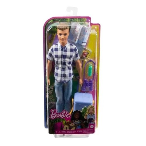 Incluye: 1 muñeco Ken con camisa de cuadros de color azul y blanca, pantalón vaquero y un par de deportivas blancas, 1 nevera portátil, 1 prismáticos, 1 botella, 1 mapa, 1 gafas de sol y 1 bolsa de frutos secos.