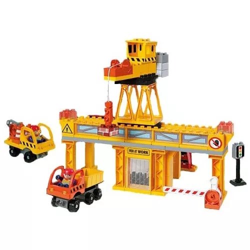 Playset Gran obra de construcción con grúas y dos vehículos.