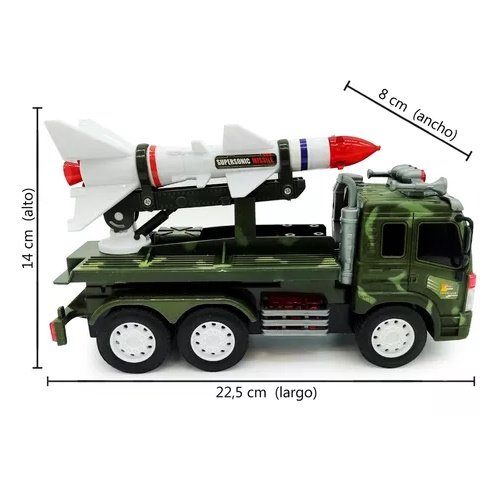 Presentamos el Camión Militar con Misil a Fricción de Pitukitos Juguetería, un vehículo diseñado para estimular la imaginación de los más pequeños. Con unas dimensiones de 14 cm de altura, 22.5 cm de largo y 8 cm de ancho, este camión es perfecto para manos pequeñas y aventuras emocionantes. Su diseño robusto y atractivo lo convierte en un compañero ideal para juegos de rol y exploraciones.