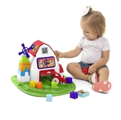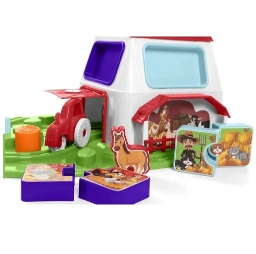 Varias piezas para encajar, desarrollar la coordinación motora, la creatividad y los conocimientos generales. En el granero, cada ventana muestra un escenario diferente con piezas de rompecabezas que se ajustan a las ventanas. Mientras tanto, en el establo, los animales miran al caballo caminar. Y el tractor sigue funcionando, atravesando el granero. El juego es aún más divertido con el misterioso portal, que viene con una abertura flexible para recoger las pequeñas piezas del interior del granero. Hay más de quince piezas desmontables para jugar.