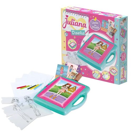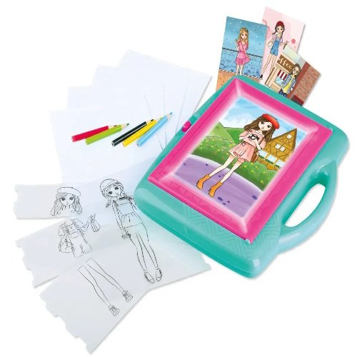 Incluye: 18 filminas transparentes, 1 estudio con luz, 5 lápices de colores, hojas blancas.