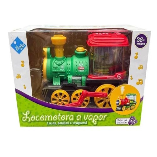 LOCOMOTORA A VAPOR – EL DUENDE AZUL Art.: 8121 Descubre todas las funciones de la locomotora a vapor y diviértete con las luces, sonidos e imágenes! ¡Nada lo detiene! La locomotora cambia de dirección con cada obstáculo. No importa que se interponga en su camino, la diversión no para. Giros y movimientos hacia todas partes con luces y sonidos. ¡Tira vapor de verdad! Funciona con 3 pilas AA (incluidas)