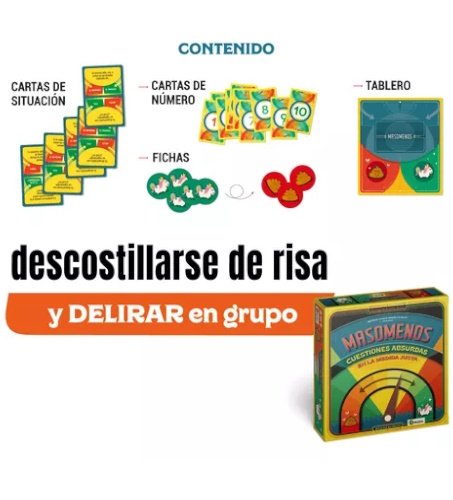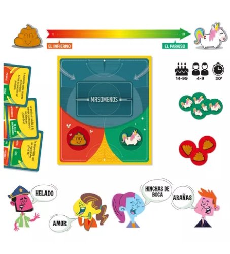 MASOMENOS es un juego cooperativo para disfrutar en juntadas, reuniones y previas con amigos y familia, todos juntos jugamos para ganar, juego colaborativo, con más de 500 temas variados, para descostillarse de risa y delirar en grupo.