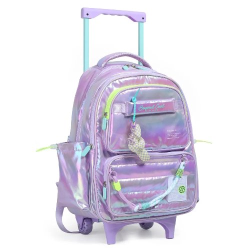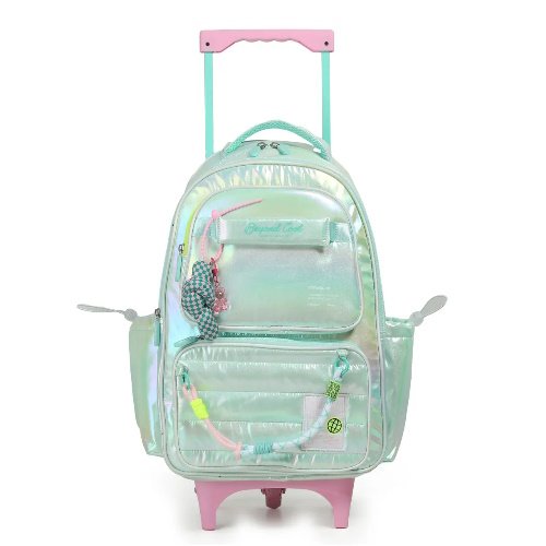 Composición Body: 100% nylon Lining: 100% polyester Características: – 18 pulgadas – Formato carro con tres ruedas de silicona – 2 compartimientos principales – 2 bolsillos frontales – 2 bolsillos laterales con cordón ajustable para botellas o snacks – Manija de agarre – Manija de carro desplegable – Tiras regulables – Interior estampado – Incluye llavero osito – Incluye cordón colorido