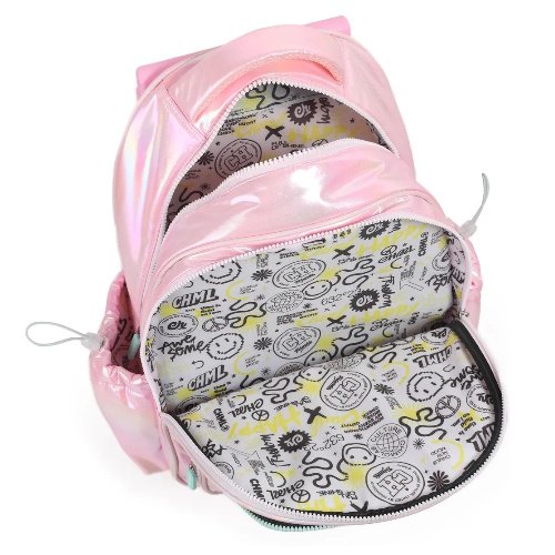 Mochila Puffy and Shiny de Chimola ¡El mix perfecto de color, brillo y diversión! La mochila Shiny de carro tiene un bolsillo acolchonado súper cool, decorado con un cordón colorido que la hace aún más divertida. Los cierres de colores y los charms colgantes de osito y cuadros le dan un look único, mientras que sus materiales tornasolados le dan un efecto mágico. Perfecta para llevar cuadernos, libros y todo lo que necesites, siempre con un toque trendy y diferente.