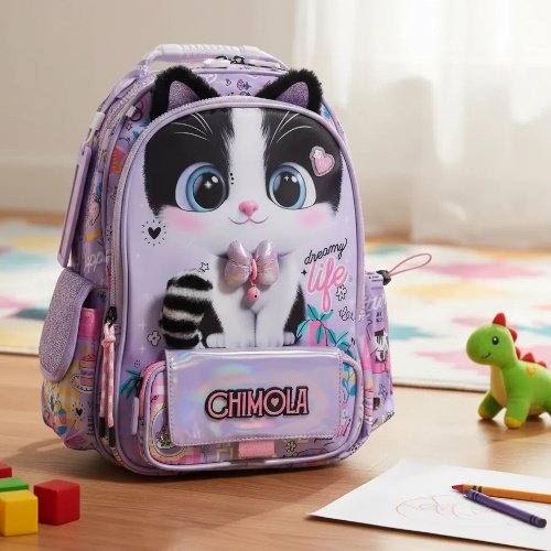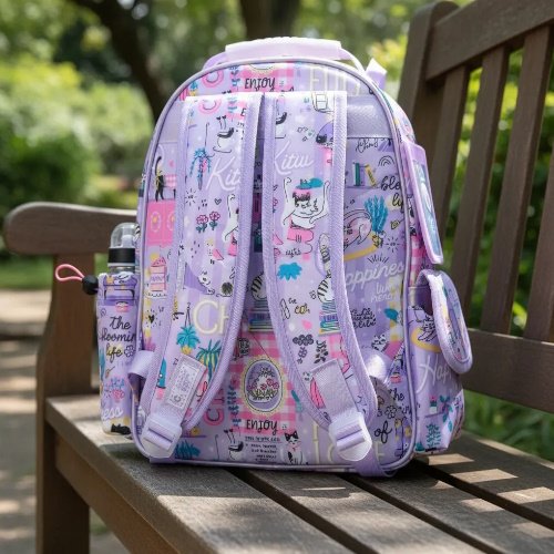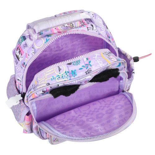 Tamaño ideal para el jardín. – Composición con tela impermeable: Body: 90% nylon, 10% PU. – Correas reforzadas con material soft, que la hace super cómoda para llevarla en la espalda. – Manija reforzada. – Detalles de bordados. – Moño con campanita colgante que suena suavemente al andar y orejitas peluditas con brillos. – Formato 3D con detalles aterciopelados y orejitas peluditas. – Tag personalizado del personaje para anotar datos personales.
