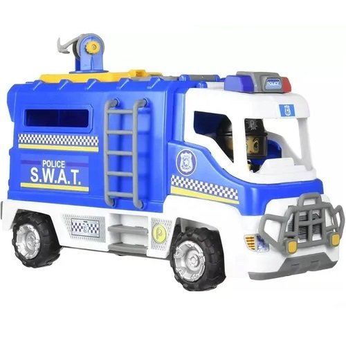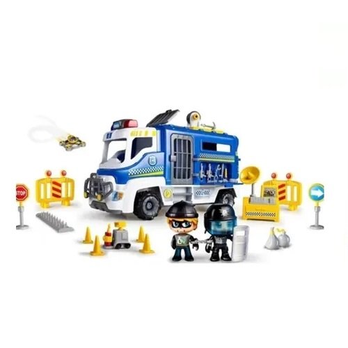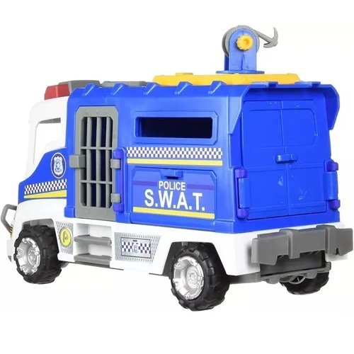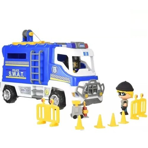 Camión lleno de acción para horas de diversión: cárcel con espacio suficiente para 2 ladrones, cabina donde pueden ir dos policías listos para entrar en acción, cajón escondido en la base para guardar todos los accesorios, cuerda con arpón con sistema de polea, y múltiples accesorios: 2 vallas, 4 conos, 2 señales de tráfico, robot desactivador de bombas, dinamita, ordenador de control, dron con mando y trampa con pinchos para control de policía