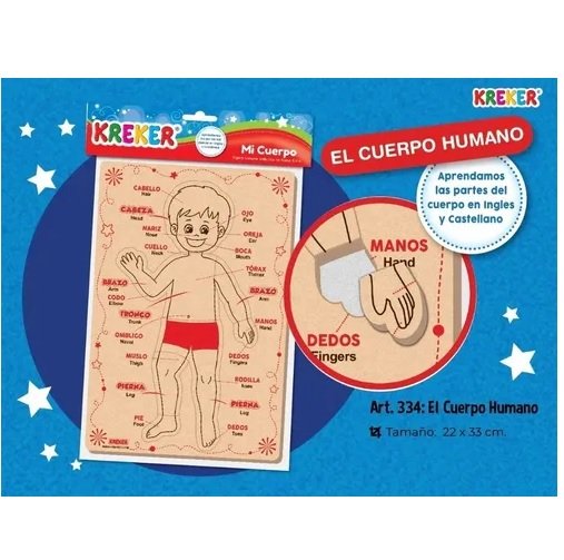 El cuerpo Humano. Esquema corporal de goma eva con serigrafia y troquelados para aprender las parte del cuerpo en español e ingles.